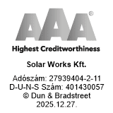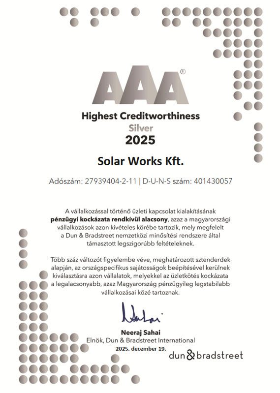 A Solar Works Kft. a Dun & Bradstreet AA (dupla A) Tanúsítványát kapta meg, mely azt jelzi, hogy velünk történő üzleti kapcsolat kialakításának pénzügyi kockázata nagyon alacsony.